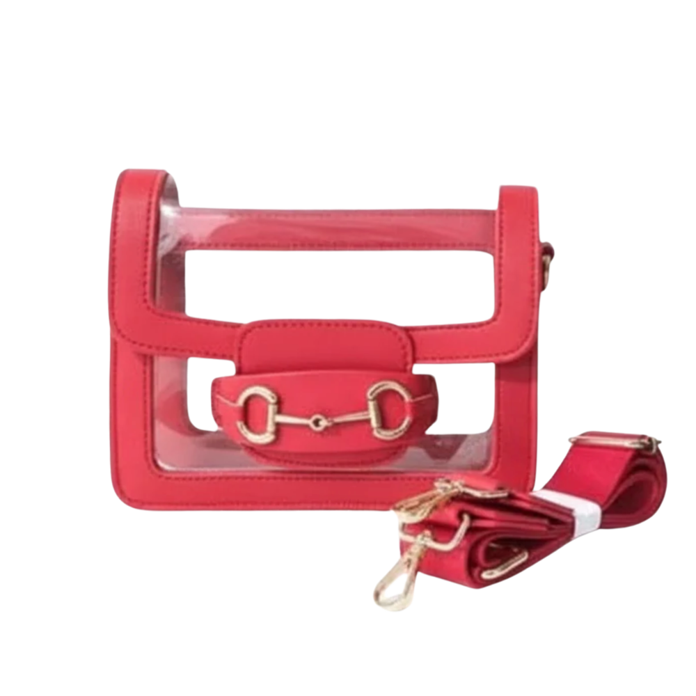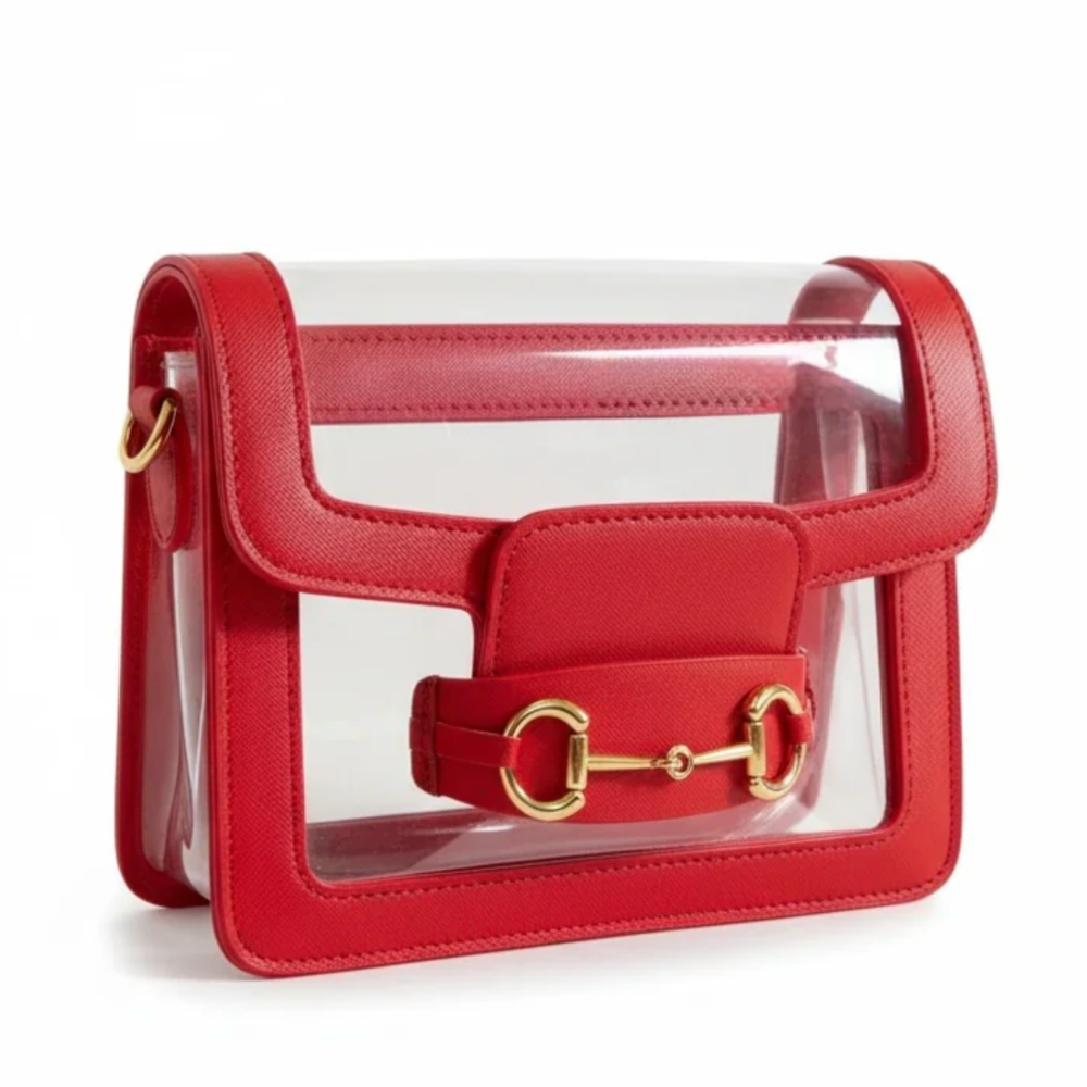 Meet Helli — This iconic style redefines the category by proving clear handbags can be both refined and functional. A refined take on a classic, clear, cross-body bag. Designed with a signature equestrian- inspired gold plated horse bit detail, this bag blends luxury styling with stadium compliance.