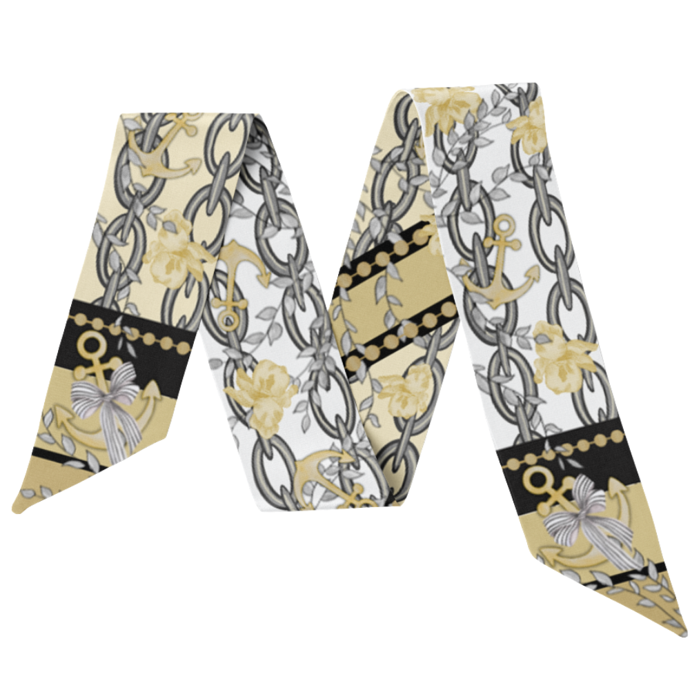 Wrap yourself in a playful, yet iconic one-of-a-kind piece in our silky scarflette! Vibrant black and gold hues play around Iris florals with whimsical illustrations of anchors and chains. This luxurious accessory captures the charm and heritage of Tennessee in every thread – perfect for locals and admirers of elegance alike. A wearable celebration of this historic community's unique character!