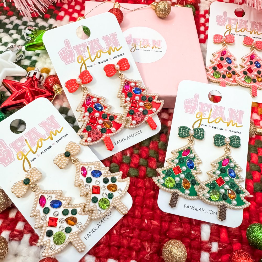 Best believe you'll be bejeweled when you walk into any room this holiday season. Our colorful jeweled Holiday Tree Bow Top Pearl Dangles are the perfect holiday show stopper to compliment any festive holiday fit.