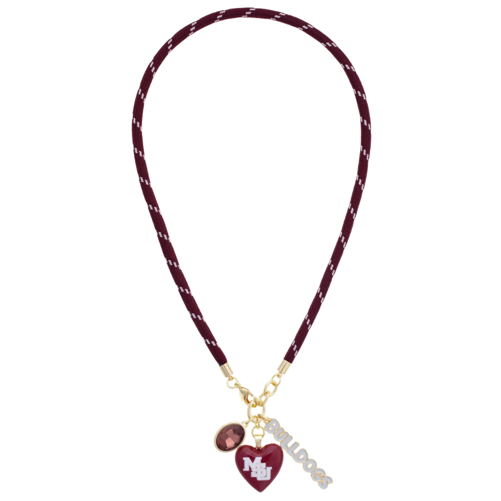 Sporty and sweet! This paracord necklace features a heart-shaped charm with the Mississippi State Bulldog logo, complementary rhinestone and gold-plated Bulldog letters, making it a cute way to show off your team pride.