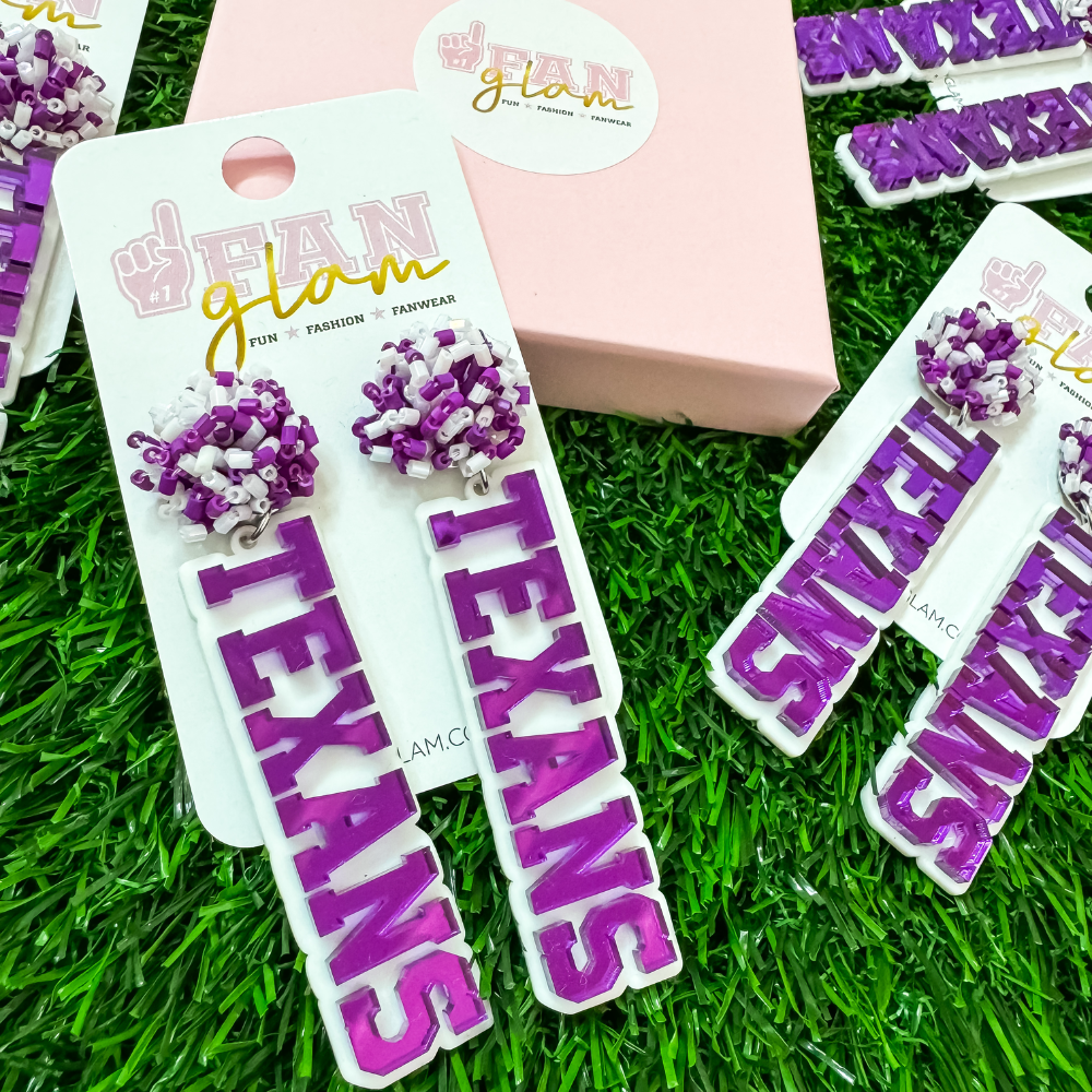 Bring the spirit and sparkle with these bold and playful “TEXANS” earrings! Featuring eye-catching purple and white beaded pom studs and a vertical acrylic “TEXANS” drop, these earrings are perfect for game day, tailgates, or showing off your team pride in style. Lightweight and full of personality!