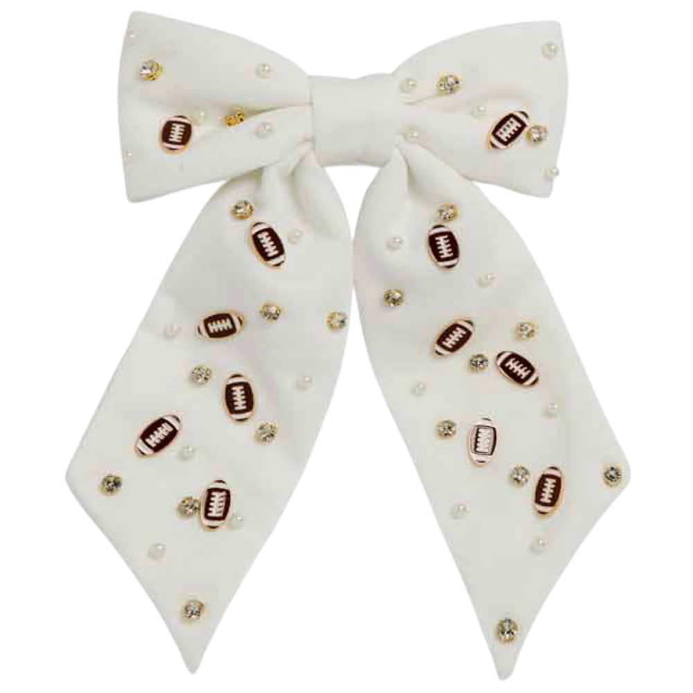 Bring a burst of team pride to any look with our Football Charm Game Day Hair Bow. Bright, bold, and full of school spirit, this eye-catching accessory has beautiful beading details with enamel football charms. Lightweight and versatile, it’s the perfect finishing touch for showing off your colors—on game day and beyond.