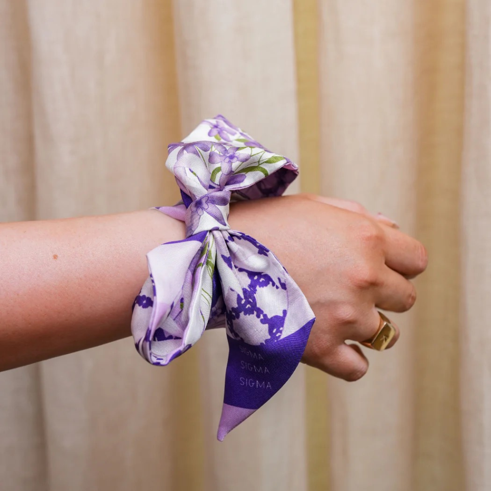 Celebrate your Sigma Sigma Sigma sisterhood with this elegant and versatile scarflette. Featuring subtle nods to the sailboat and "faithful to death" motto it's perfect for adding a sorority-inspired touch to any outfit, this accessory embodies grace and meaning, making it a timeless addition to your wardrobe.