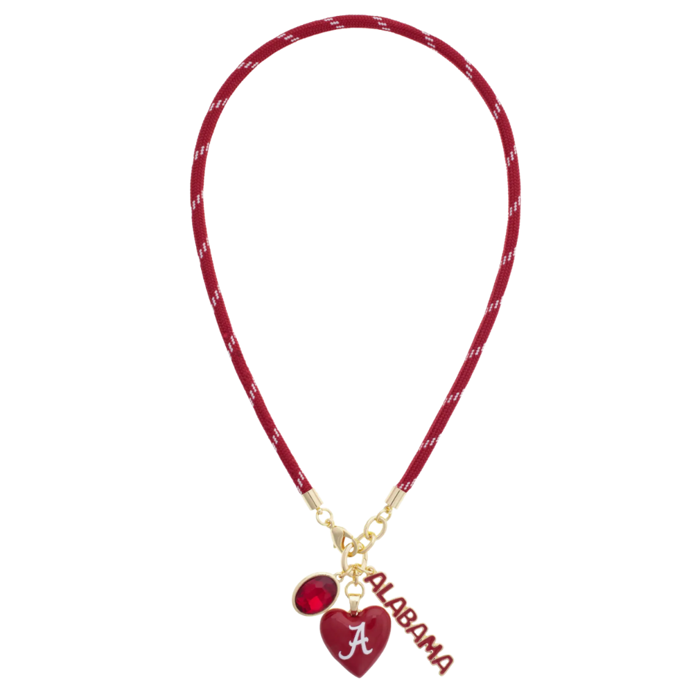 Sporty and sweet! This paracord necklace features a heart-shaped charm with the Alabama Crimson Tide logo, complementary rhinestone and gold-plated Crimson Tide letters, making it a cute way to show off your team pride.