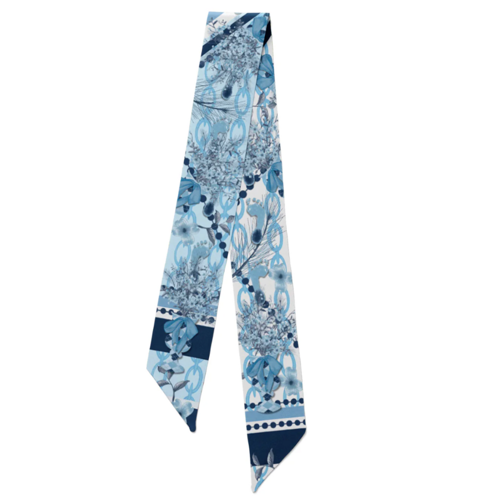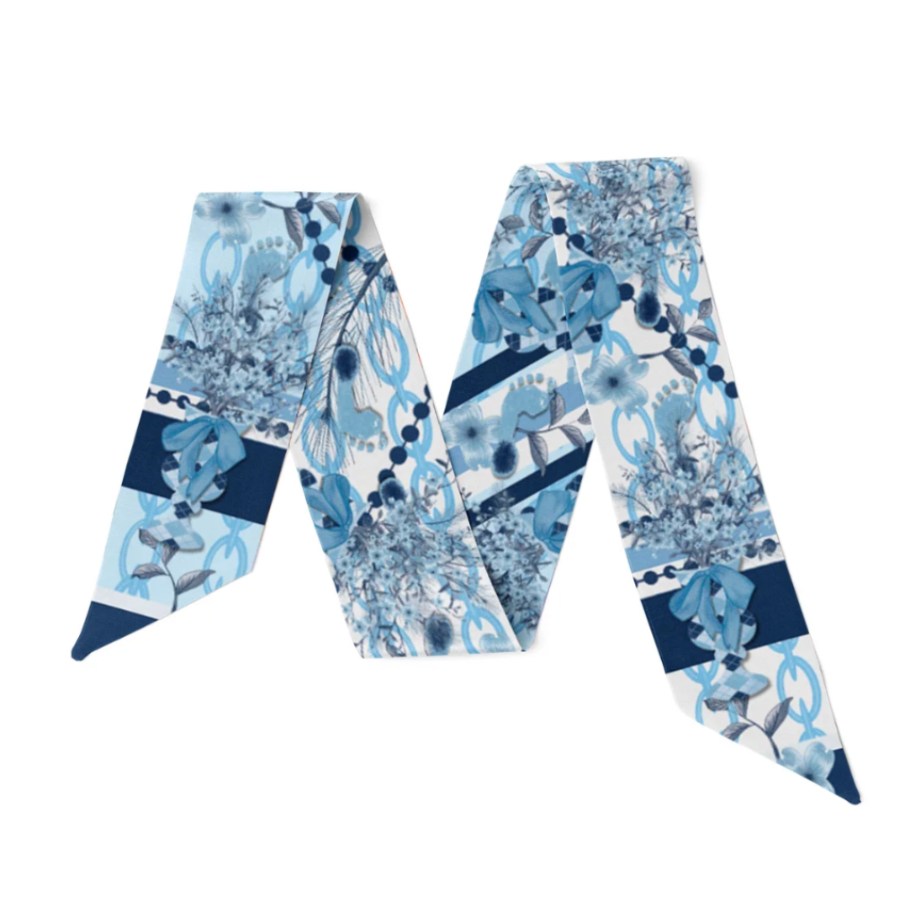 Wrap yourself in a playful, yet iconic one-of-a-kind piece in our silky scarflette! Vibrant blue and white florals dance alongside whimsical illustrations with hits of navy. This luxurious accessory captures the charm and heritage of Chapel Hill in every thread – perfect for locals and admirers of elegance alike. A wearable celebration of this historic community's unique character!