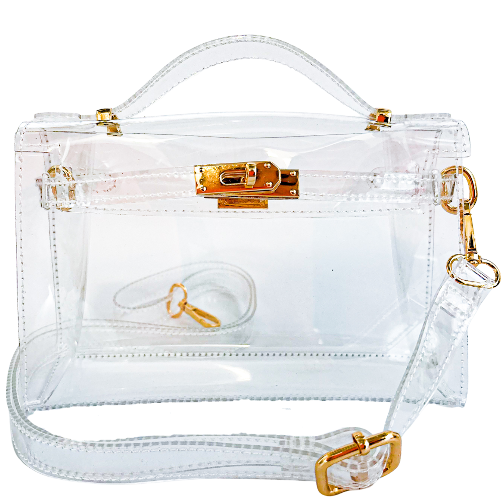 Our Monroe clear stadium-compliant handbag blends effortless style with game-day function. Crafted from premium transparent PVC and finished with gold-tone hardware and a secure turn-lock closure, it keeps your essentials visible while looking polished.