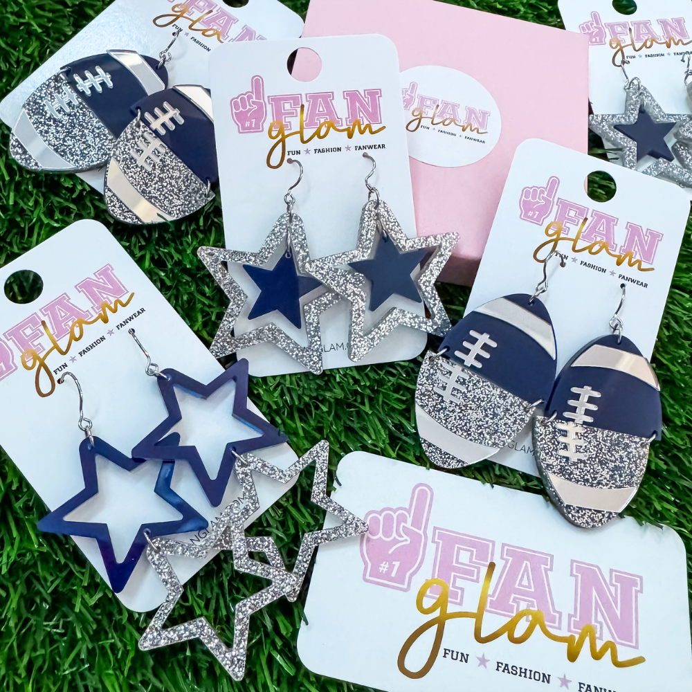 Let's Go Cowboys! Our new Glitter Glam Sideline Stars + Dual Footballs are a MUST-HAVE This Season And Pair Perfectly with ALL Your Day-To-Game Day looks.